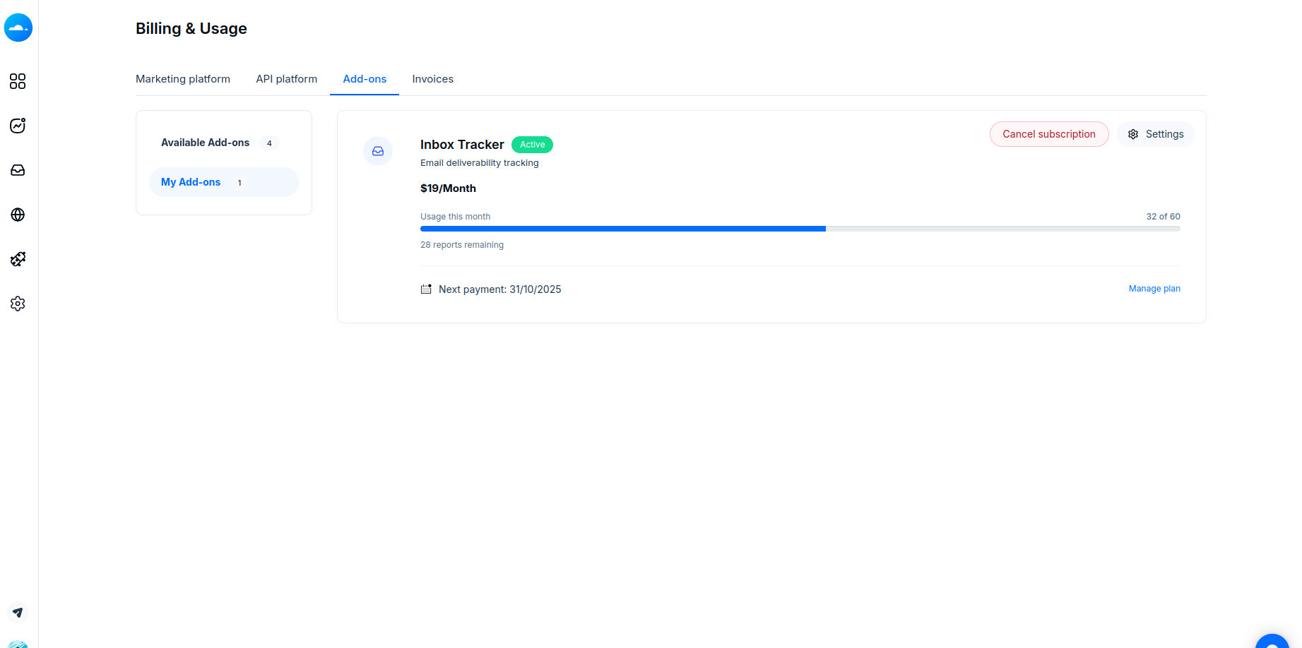 Once purchased, it will appear under the My Add-ons tab, where you can also track your plan usage details.