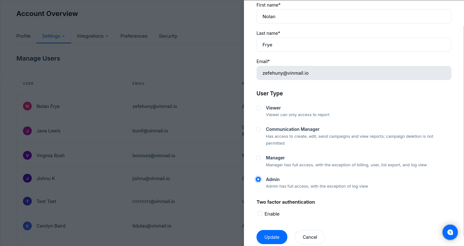 Account owners can manage 2FA settings for each subuser individually.