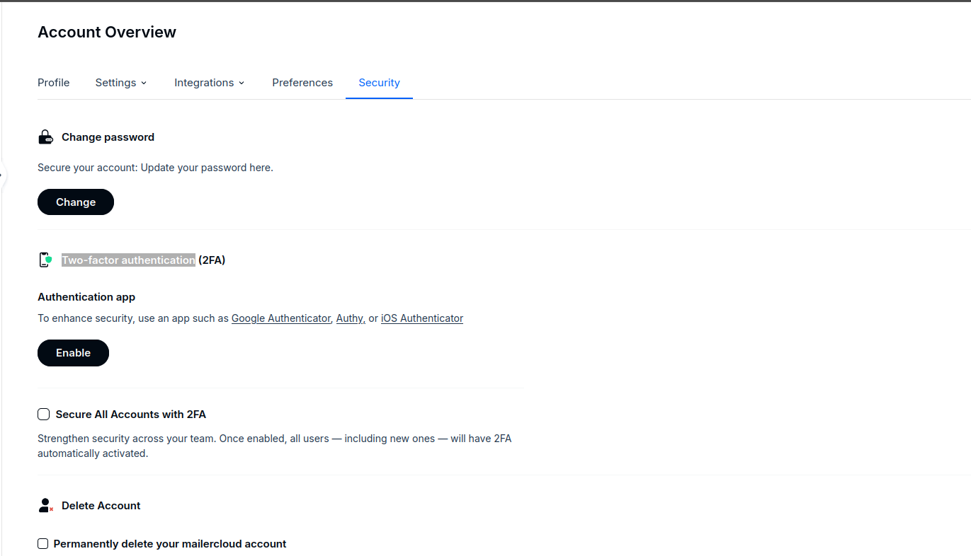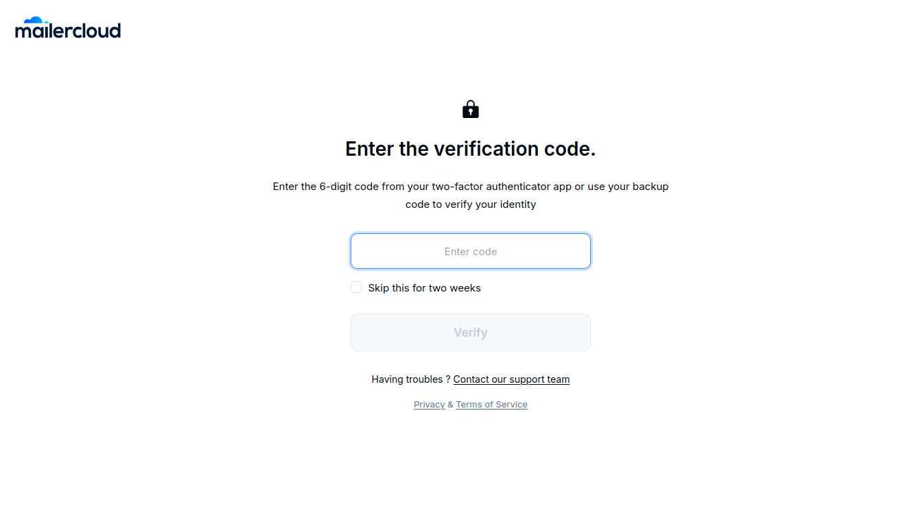 Two-factor authentication (2FA) adds an additional layer of security to your Mailercloud account. When enabled, you must enter a verification code—along with your password—each time you log in. This ensures only authorized users can access the account.