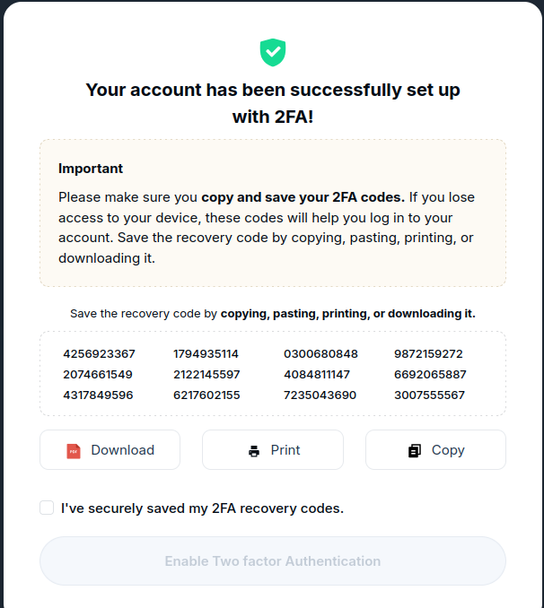 Codes are shown only one time, so save them securely.